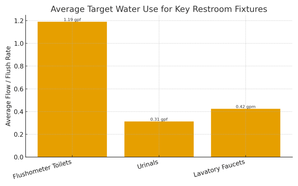 - Apply target values: 1.1–1.28 gpf for flushometer toilets; 0.125–0.5 gpf urinals; 0.35–0.5 gpm lavatory faucets